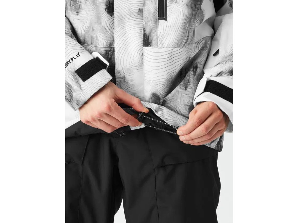 | Funkční prvky: | pevná kapuce, voděodolné zipy, ventilační otvory na zip v oblasti podpaží, 2 boční kapsy na zip, regulovatelné rukávy suchými zipy, kapsa na skipas, elastické manžety v rukávech, regulovatelný spodní lem na stažení, vnitřní sněhový pás, vnitřní síťovaná kapsa |