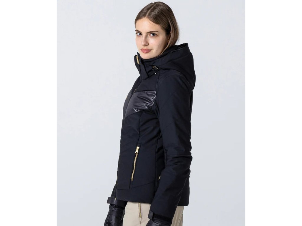 Mezi praktické prvky patří odnímatelná kapuce, odvětrávání v podpaží a důraz na pohodlí při celodenním lyžování.