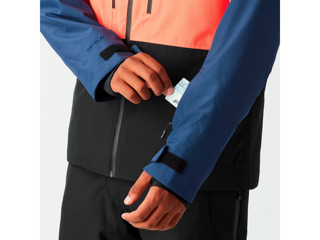 | Funkční prvky: | nastavitelná pevná kapuce, voděodolné zipy, 2 boční kapsy na zip, 2 náprsní kapsy na zip, elastické manžety s otvory na palce, regulovatelné rukávy suchými zipy, kapsa na skipas na zip, ventilační otvory na zip v oblasti podpaží, regulovatelný spodní lem na stažení, vnitřní shěnový pás, vnitřní síťovaná kapsa, vnitřní kapsa na zip |